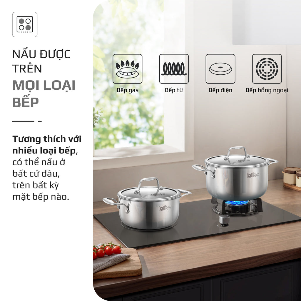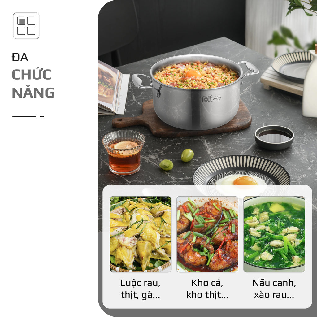 - Không phủ chống dính hóa học, không chứa chất độc hại, Bộ nồi Inox OLIVO Davinci mang đến sự an tâm tuyệt đối cho sức khỏe gia đình bạn.