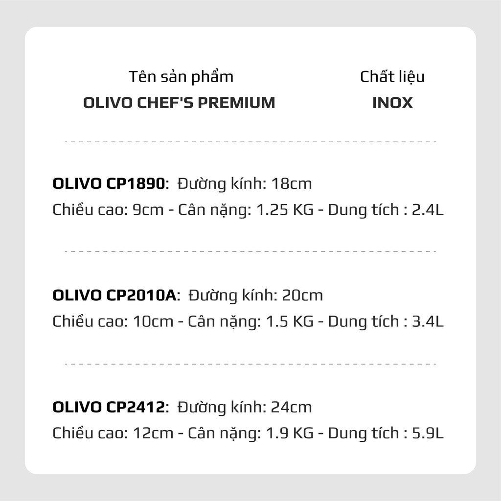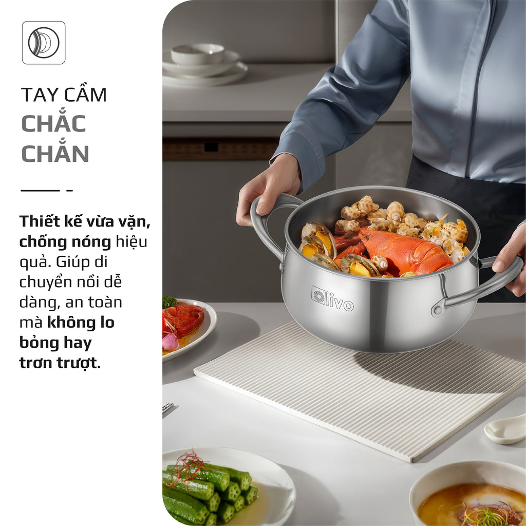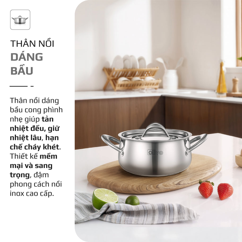 - Từ chất liệu inox liền khối cao cấp, thiết kế dáng tròn tinh tế, đến tính năng tản nhiệt đều, đa dạng kích thước, bộ nồi inox OLIVO Chef’s Premium không chỉ là dụng cụ nấu ăn, mà còn là biểu tượng của phong cách sống hiện đại, nâng tầm trải nghiệm nấu nướng và chăm sóc sức khỏe cho gia đình Việt.