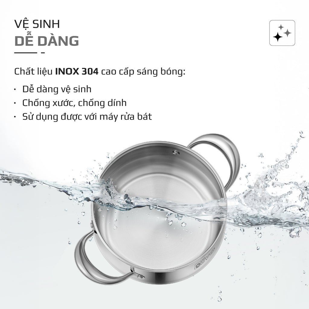 - Chất liệu Inox nhẵn mịn, hạn chế bám dính thực phẩm, không ám mùi, dễ dàng làm sạch chỉ với một chút nước rửa chén và miếng bọt biển mềm.