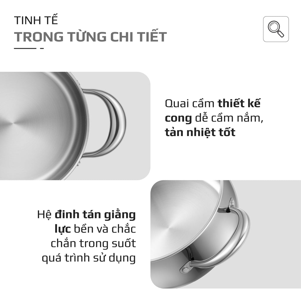 - Tay cầm bằng inox tán đinh chắc chắn, cách nhiệt tốt, giúp di chuyển nồi an toàn và thoải mái trong quá trình nấu nướng.