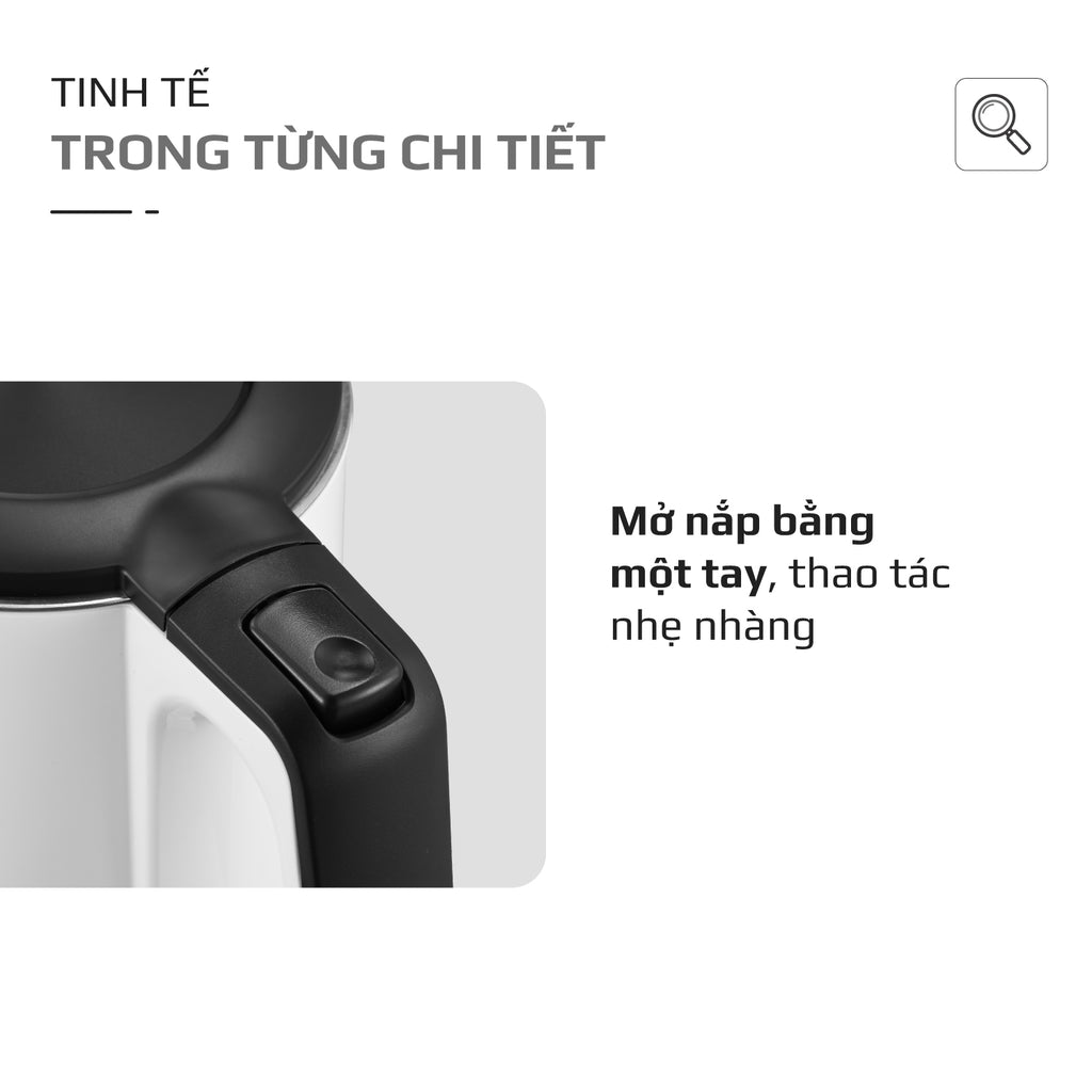 - Được trang bị hệ thống bảo vệ 4 lớp giúp quá trình đun sôi an toàn, chống đun khô hiệu quả và rút ngắn thời gian làm sôi nước. Chất liệu cao cấp, an toàn cho sức khỏe, kết hợp thao tác sử dụng nhẹ nhàng mang đến trải nghiệm tiện lợi, sạch sẽ và bền đẹp theo thời gian.
