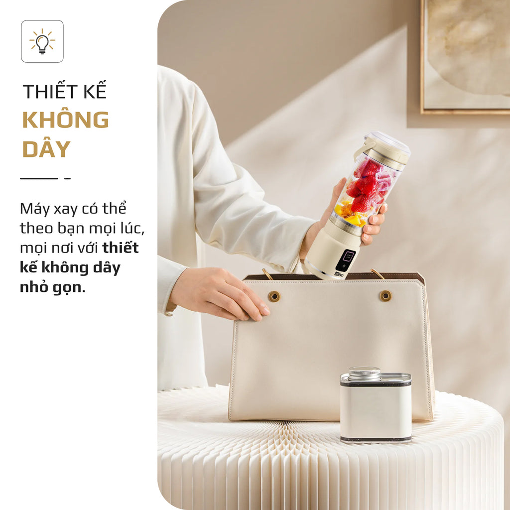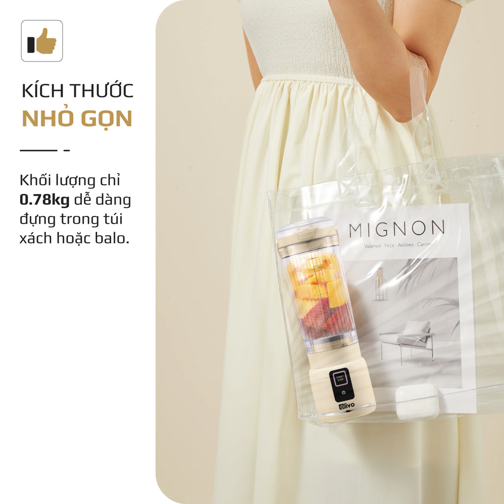OLIVO PB02 được thiết kế gọn nhẹ, hiện đại, dễ dàng bỏ vào balo hay túi xách để mang theo khi đi làm, du lịch, công tác hay dã ngoại. Nhờ vậy, bạn có thể thưởng thức ly sinh tố tươi ngon ở bất cứ đâu mà không bị giới hạn không gian. Sản phẩm sử dụng pin sạc dung lượng 2000mAh x2, cho thời gian hoạt động ấn tượng. Chỉ cần sạc đầy, PB02 có thể đồng hành cùng bạn suốt cả ngày với nhiều lần xay liên tiếp mà không lo hết pin.
