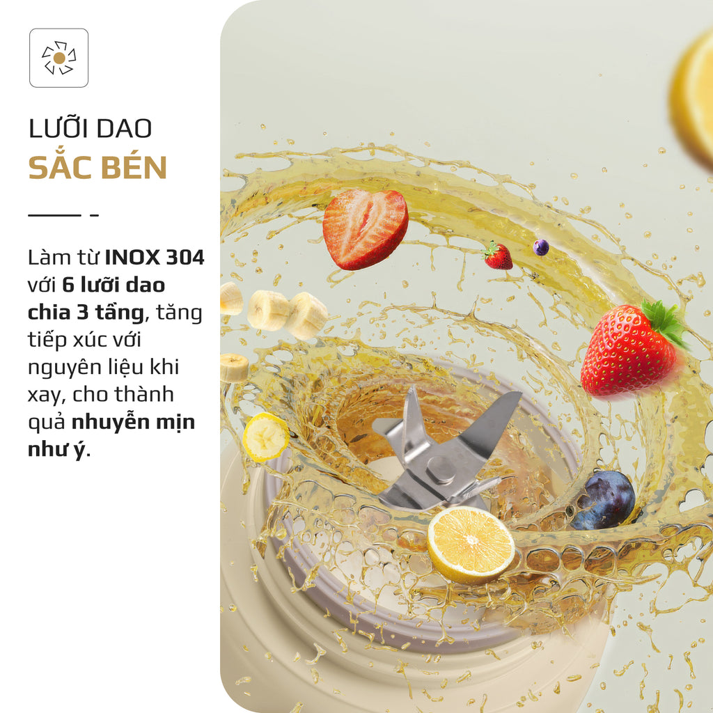Lưỡi dao là yếu tố then chốt quyết định độ mịn và chất lượng của đồ uống. OLIVO PB02 được trang bị lưỡi dao 6 cánh 3 tầng sắc bén, chế tạo từ inox 304 bền bỉ, chống gỉ sét và hoàn toàn an toàn khi tiếp xúc thực phẩm. Thiết kế lưỡi dao đa tầng giúp tăng diện tích tiếp xúc với nguyên liệu, xay nhuyễn mịn chỉ trong vài chục giây, kể cả đá viên hay hoa quả đông lạnh.