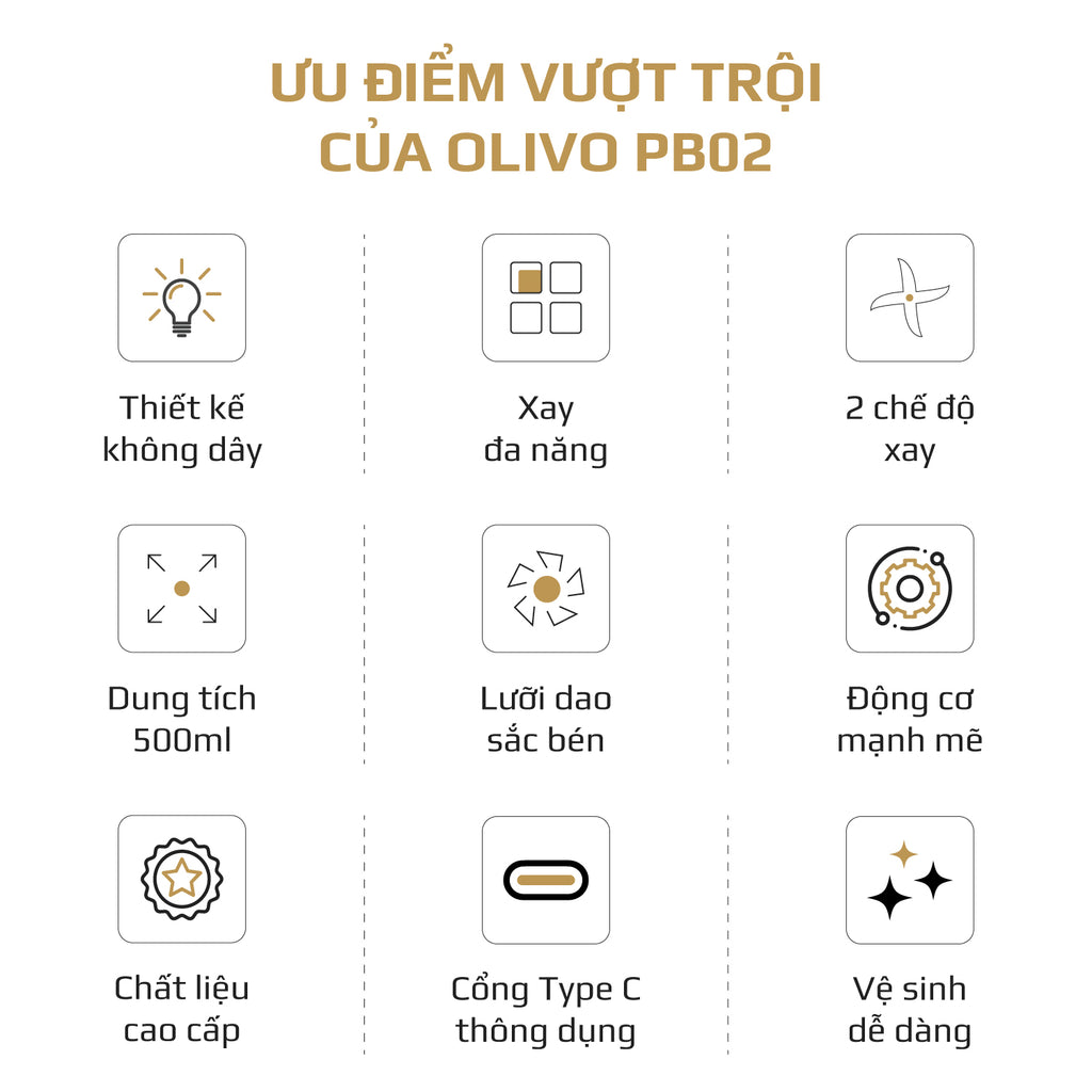 OLIVO PB02 sở hữu dung tích 500ml, vừa đủ để pha chế lượng sinh tố, smoothie hay đồ uống dinh dưỡng cho 1–2 người trong một lần xay. Dung tích này giúp bạn dễ dàng kiểm soát lượng nguyên liệu, hạn chế lãng phí và tiết kiệm thời gian chuẩn bị. Nhờ đó, bạn luôn có thể thưởng thức đồ uống tươi ngon, giữ trọn hương vị và dinh dưỡng ngay khi vừa xay xong.