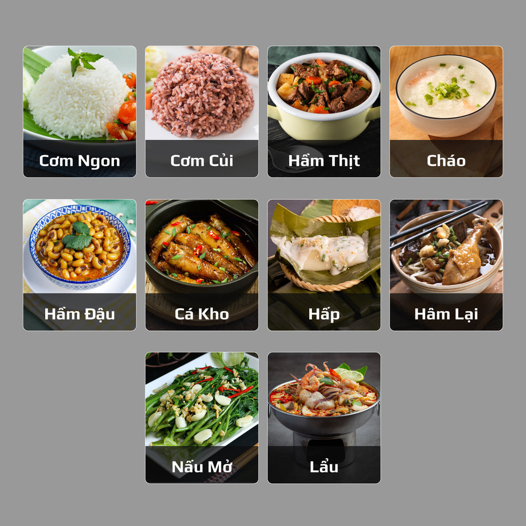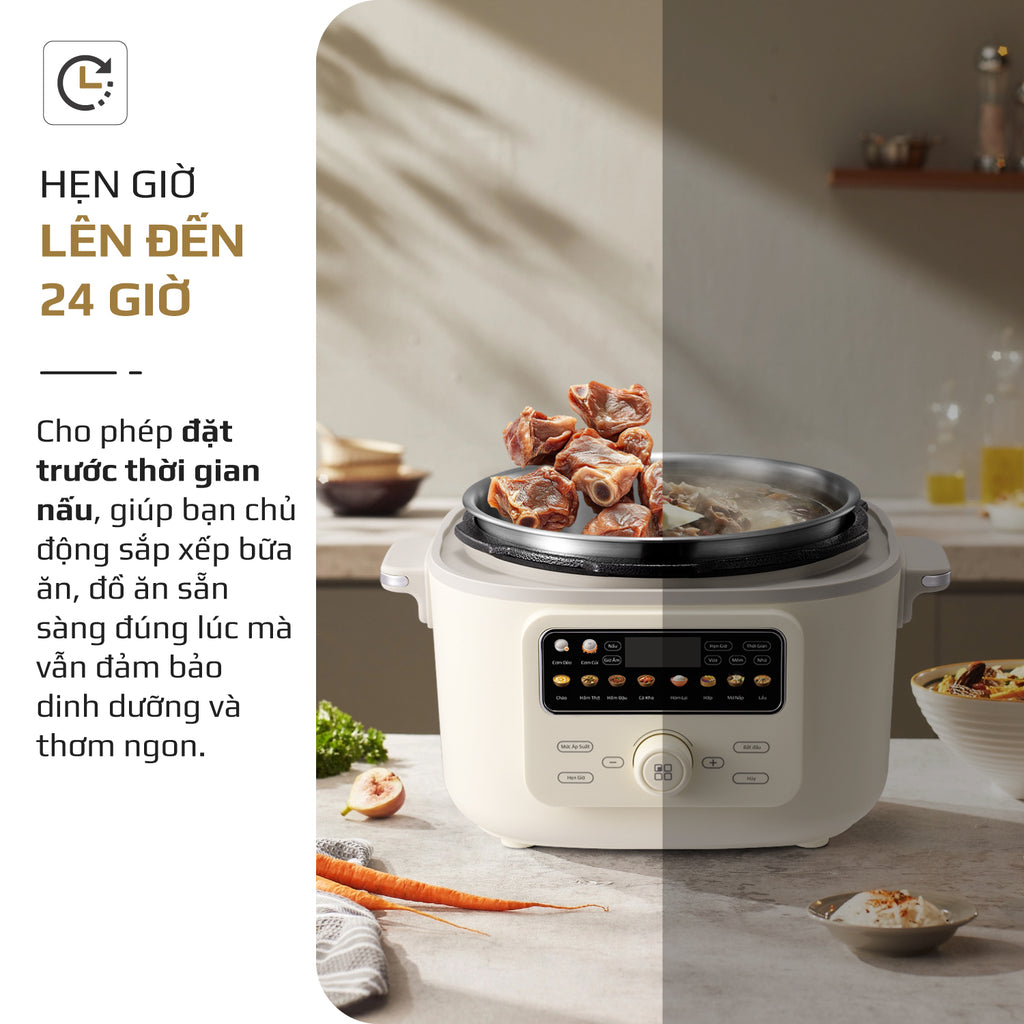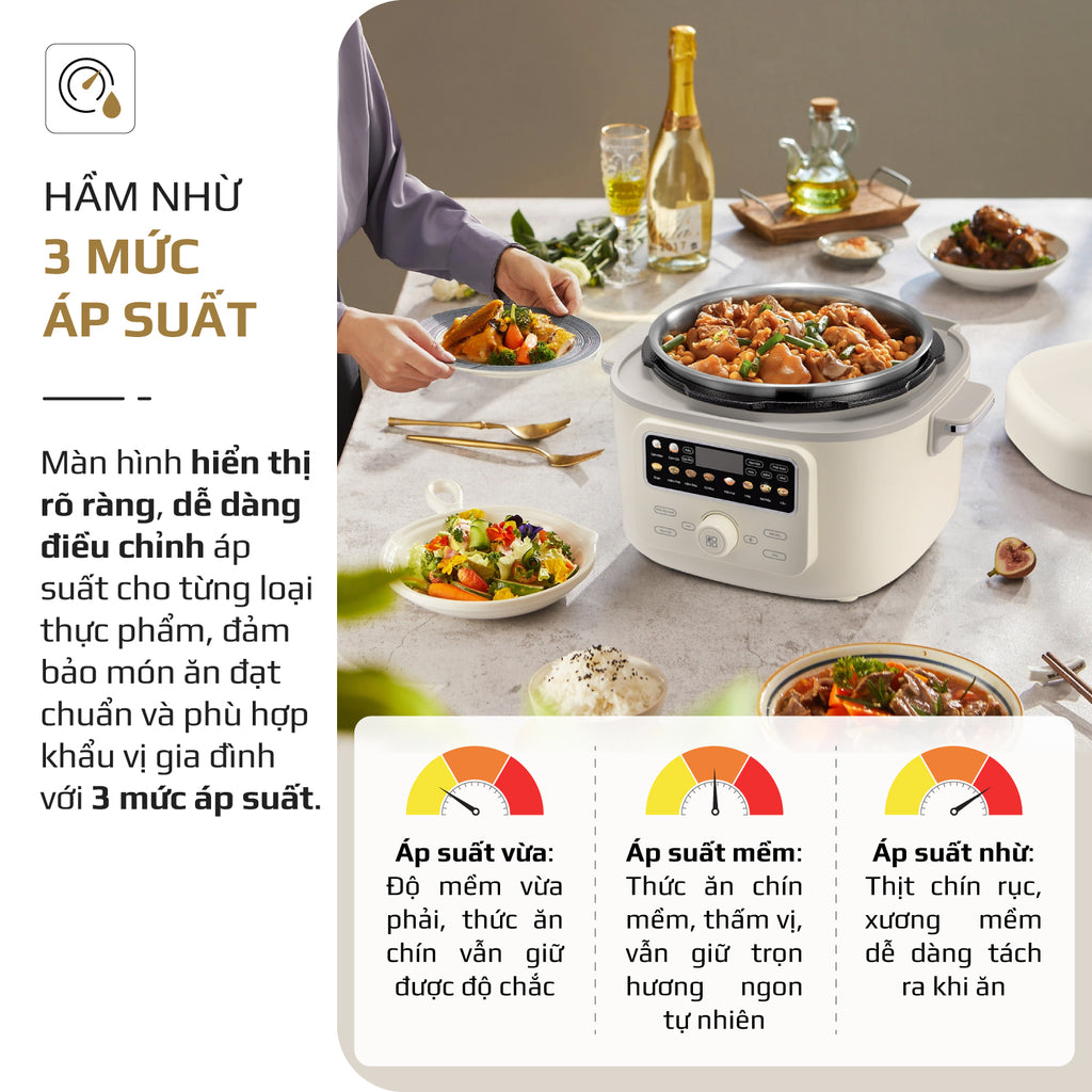 Nấu ăn đơn giản – Nhàn tênh mỗi ngày: Với các chương trình nấu cài đặt sẵn, người dùng chỉ cần chuẩn bị nguyên liệu, cho vào nồi, chọn chế độ phù hợp. Nồi sẽ tự động điều chỉnh nhiệt độ, áp suất và thời gian nấu, sau đó chuyển sang chế độ giữ ấm khi hoàn tất.