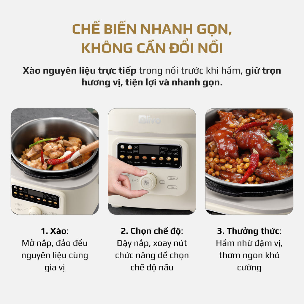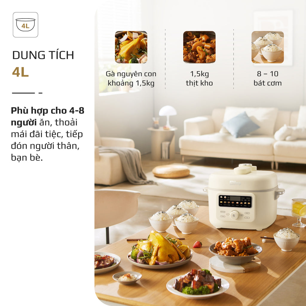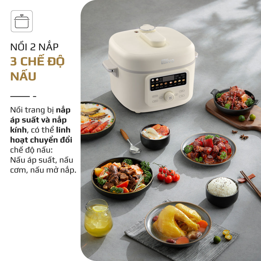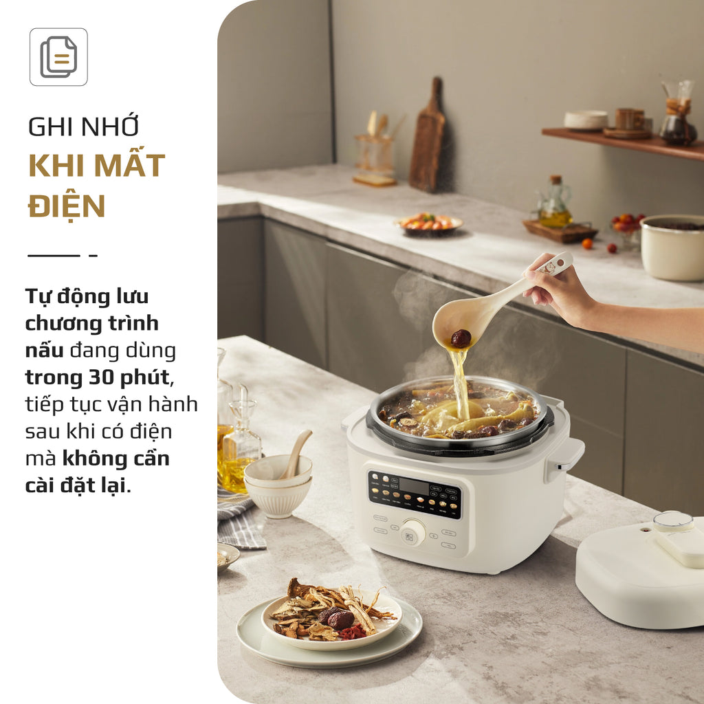 Nấu ăn đơn giản – Nhàn tênh mỗi ngày: Với các chương trình nấu cài đặt sẵn, người dùng chỉ cần chuẩn bị nguyên liệu, cho vào nồi, chọn chế độ phù hợp. Nồi sẽ tự động điều chỉnh nhiệt độ, áp suất và thời gian nấu, sau đó chuyển sang chế độ giữ ấm khi hoàn tất.