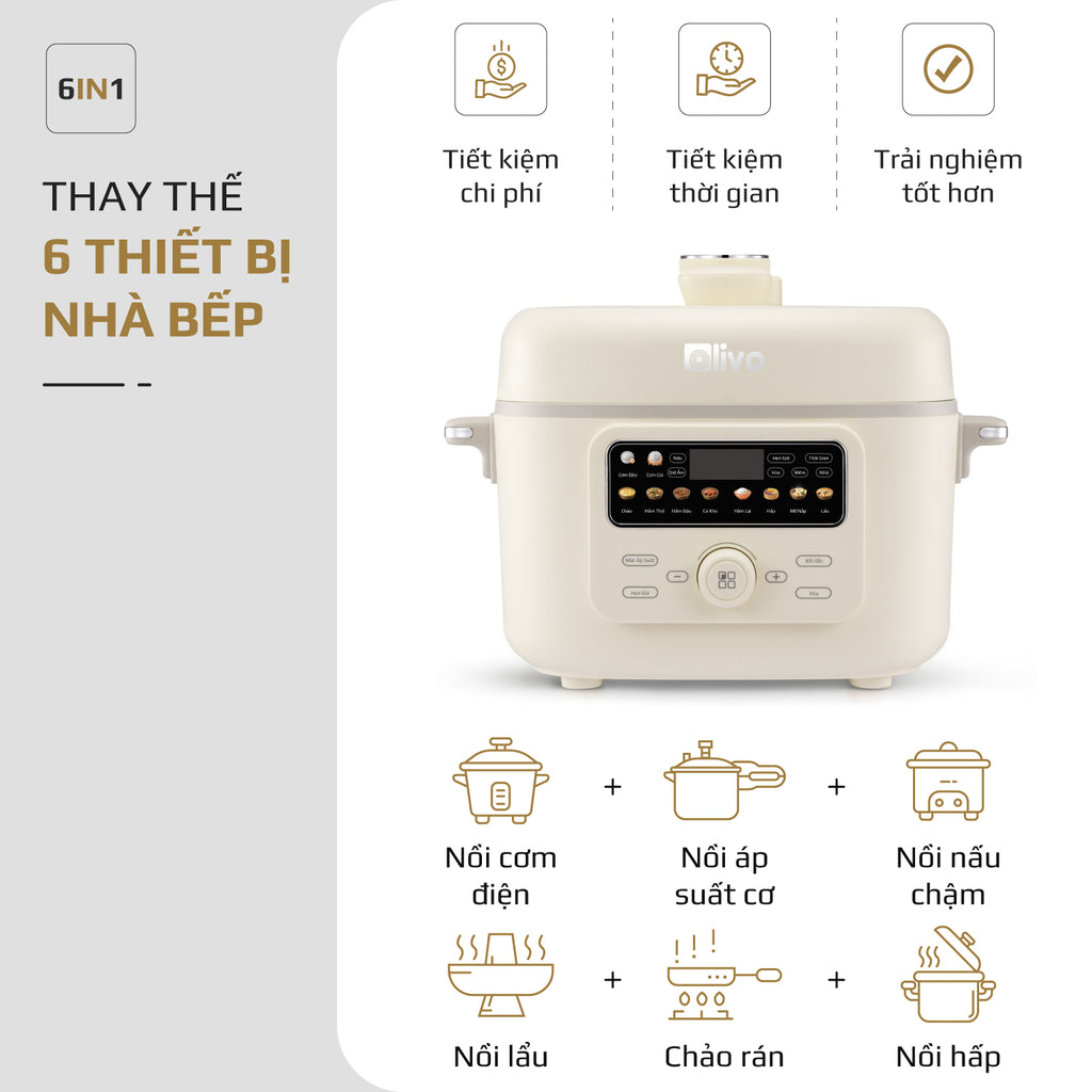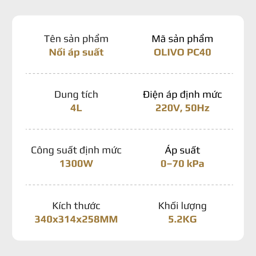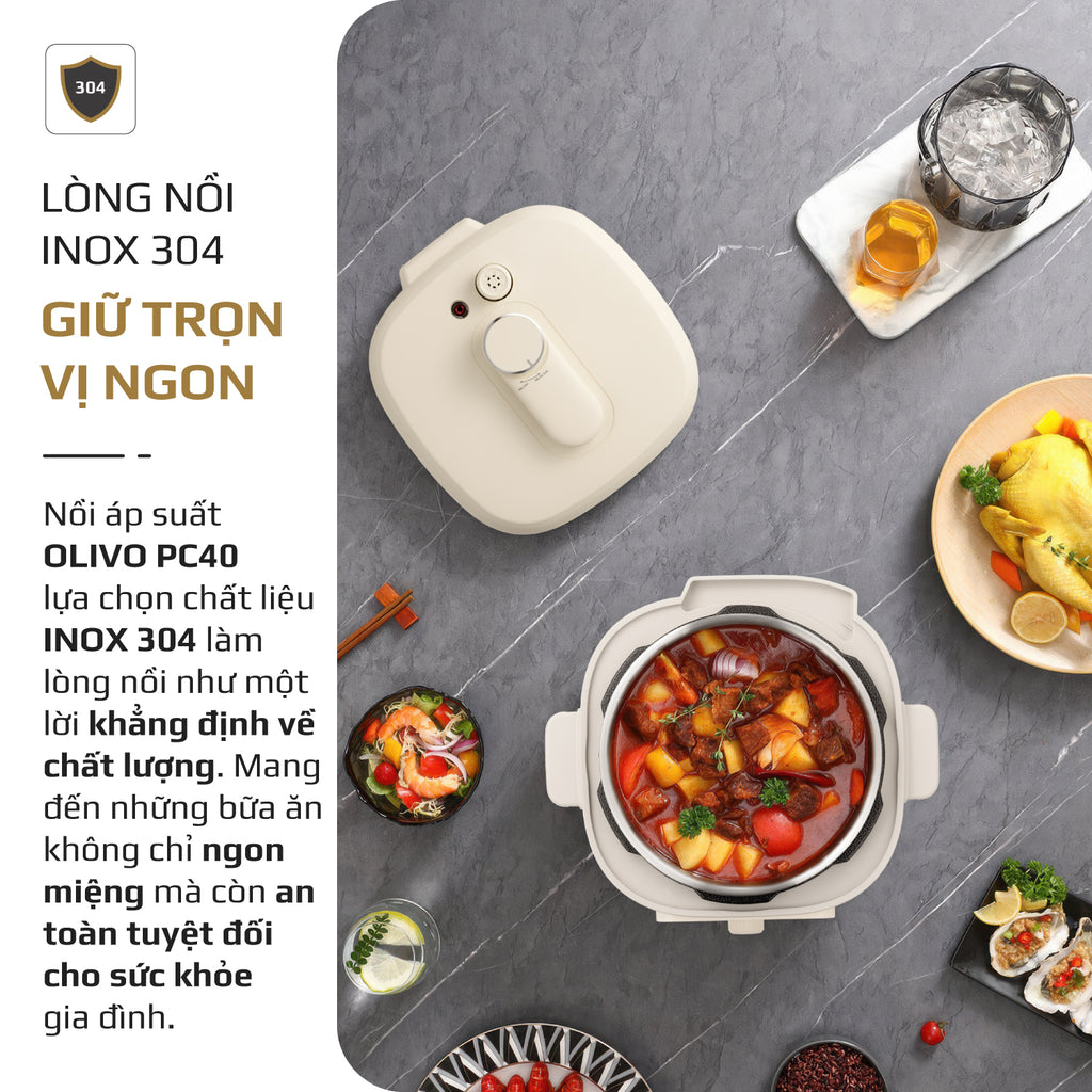 - Thấu hiểu nhu cầu đó, OLIVO trân trọng giới thiệu Nồi áp suất điện OLIVO PC40 – sản phẩm hội tụ giữa công nghệ áp suất thông minh, thiết kế cao cấp và tính năng đa năng, mang đến trải nghiệm nấu ăn tiện nghi, linh hoạt và an tâm cho mọi gia đình.