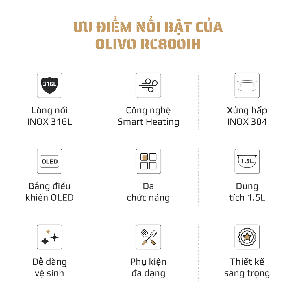 - Không chỉ là thiết bị nấu nướng, nồi cơm điện cao tần OLIVO RC800IH còn là điểm nhấn tinh tế trong không gian bếp của mọi gia đình hiện đại.
