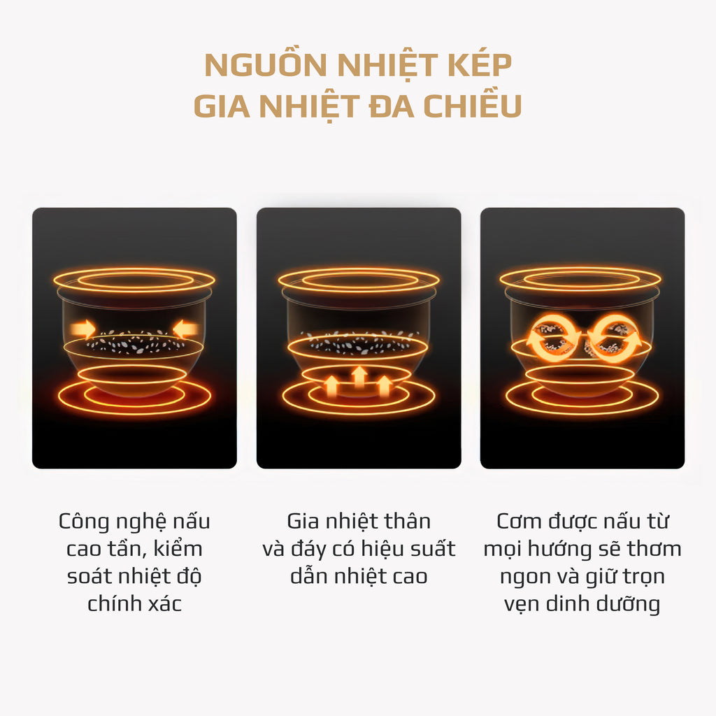 Gia nhiệt đa chiều – hạt cơm chín đều từ trong ra ngoài: Mỗi hạt gạo được làm chín kỹ, dẻo mềm và tơi xốp, mang lại cảm giác cơm thơm ngon, trọn vị như cơm nấu bằng bếp củi truyền thống.